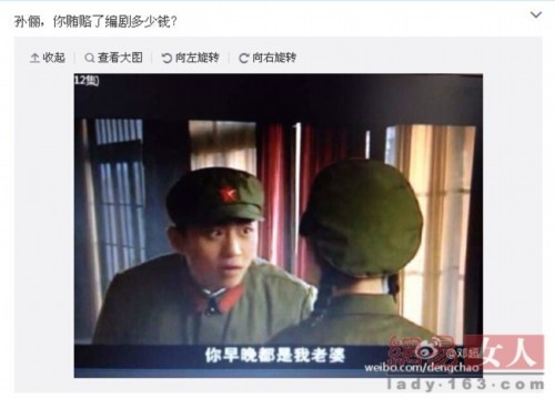 邓超晒出一张电视剧《幸福像花儿一样》截图剧照,照片中,邓超饰演的“白杨”正对着孙俪饰演的“杜鹃”霸道表白:“你早晚都是我老婆。”还质问孙俪贿赂了剧组多少钱