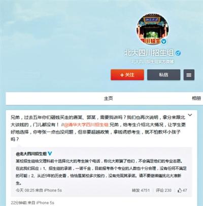 北大四川招生组不甘落后,很快回应,并且明确指责对方花钱“买”考生:兄弟,过去五年你们砸钱买走的唐某、郭某,需要我讲吗?我们也再次说明,拿分来跟北大谈钱的,门儿都没有!