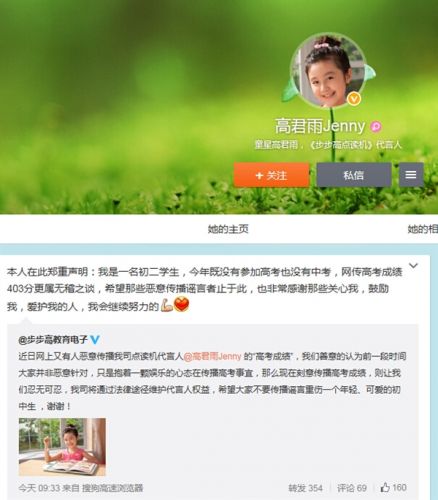 “点读机”女孩的本尊高君雨今天下午通过个人微博回应称,网上有关考试失利的消息都是假的,自己目前仍是一名初二的学生,没有参加中考、更没有参加高考,请大家不要听信谣言。