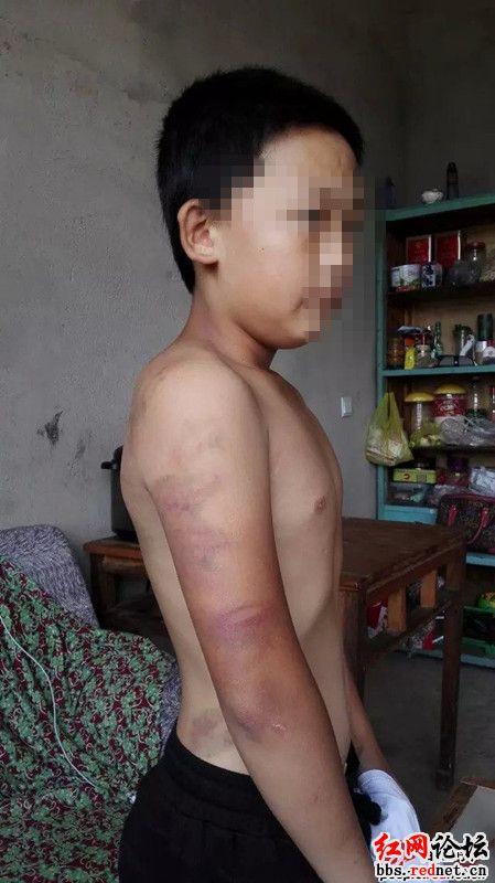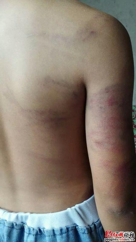 2015年6月12日晚,上小学五年级的小豪(化名)很晚才回家。回家后没吃晚饭就睡下了。第二天早上,叫孩子吃早饭的奶奶和姑姑发现11岁的小豪“全身多处淤青,简直就是遍体鳞伤”。在姑姑的追问下,小豪说出了自己身上的伤是被四年级的谭老师打的。在红网论坛的图片中,孩子全身多处淤青红肿,有的地方还被打破了皮。