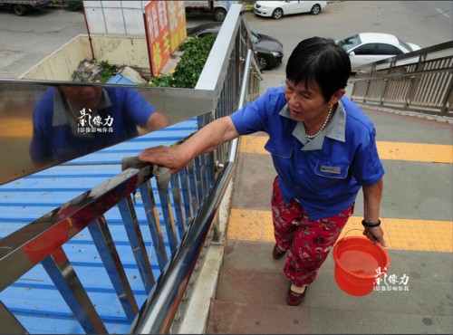 樊庆考告诉记者,他和妻子冀凤云从去年开始负责这座“过街天桥”上的卫生,一天打扫4遍,从未间断过。尽管气温高达三十五六度,冀凤云仍然冒着酷暑打扫卫生。(张伟摄)
