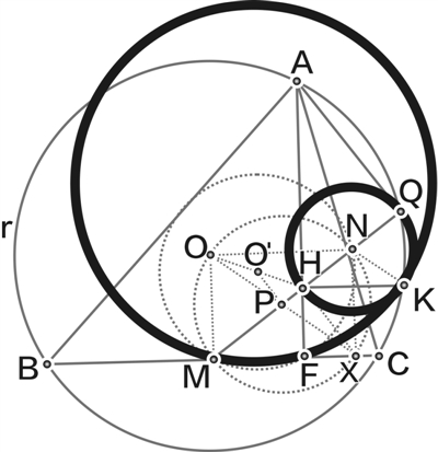 在锐角三角形ABC中,AB>AC,设r是它的外接圆,H是它的垂心,F是由顶点A处所引高的垂足,M是边BC的中点,Q是r上的一点,使得∠HQA=90°。K是r上的一点,使得∠HKQ=90°。已知点A、B、C、K、Q互不相同,且按此顺序排列在r上,证明:三角形KQH的外接圆和三角形FKM的外接圆相切。