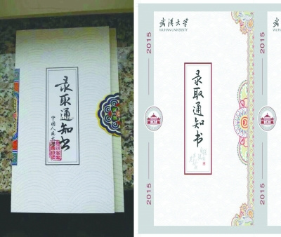 前日,武汉大学官方微博微信公布了该校今年录取通知书的图片。从昨日中午开始,陆续有人在网上发帖称武汉大学今年的录取通知书和中国人民大学去年的很相似,质疑武大抄袭人大创意。长江日报记者联系武大和人大的相关负责人,但截至发稿时间,双方皆未给出回应。