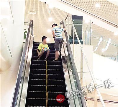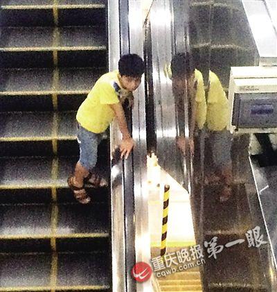 昨日下午1点过,重庆晚报记者来到位于渝中区解放碑旁的新华书店。很快,一名穿着红白条纹衣服的男孩乘坐下行扶梯,走了几步他将右脚搭在了扶梯围裙板上。扶梯运行到一半,男孩看到前面没人,俯着身子大步往下冲。