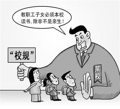 近日,江苏宿迁一所学校的教职工向媒体反映,该校强制要求教职工子女在升学时必须报考本校,不然就停职处理,他们觉得校方的规定不合理。校方对此回应称,学校自2014年起就有这样的规定,是学校董事会的决议。教职工子女在本校就学这个要求,从情理上讲或许可以理解,但是作为硬性规定,显然侵害了教职工的权益。学校可以有自身的规章制度,但不能与教育法规和入学政策相抵触。期待教育主管部门能认真调查、妥善处理,让这样的奇葩校规越少越好。(时 锋)