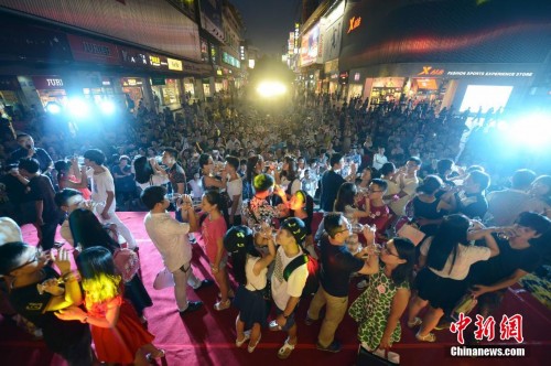 8月20日,正值“七夕”情人节。当晚,上百对情侣来到长沙黄兴路,执子之手共饮“对酒”,表达最深情的浓浓爱意。