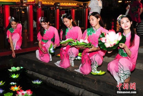 8月20日,“荷花仙子”放河灯祈福。当日是中国传统的七夕节,济南“荷花仙子”们在护城河畔泉水码头放河灯为市民祈福。