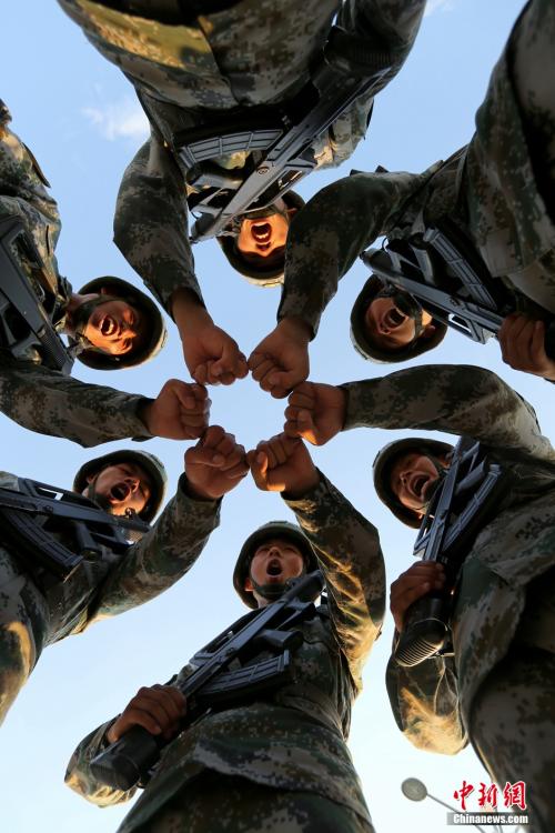 16:00-在阅兵式训练考核前,官兵相互加油鼓劲。