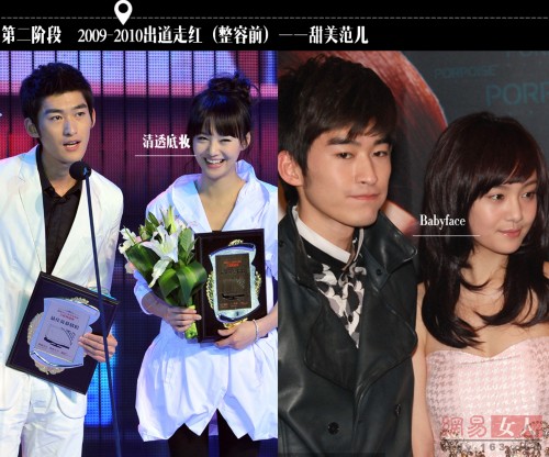 既然提到了塘主,就说下他喽,两人即09年合作完第一部剧之后,2010年又一起拍摄了《流星雨》续集,还共同完成了5部广告代言,默契指数那是直线上升啊,荧屏CP也是深入人心最后变真实CP。这时的爽妹子还有是着微微Babyface。清秀的眉毛,细细的眼线,清透的底妆,都展现出了她甜美稚嫩的少女范儿。