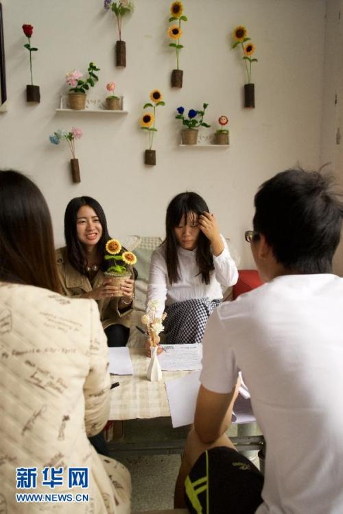 9月22日,徐莉(左)为前来咨询的客人介绍自己的产品。今年22岁的徐莉是南昌市工程学院的大三学生。2014年5月,她的“特别花店”在南昌市工程学院大学生创业园正式开业,主要销售由黄豆、肥皂、毛线、橡皮泥等材料制成的仿真花卉。据徐莉介绍,她制作的“鲜花”外观生动明丽,且形状和材料还可按客人要求进行“私人定制”,所以受到很多顾客的认可,目前花店的月利润可达2000至3000元。新华社记者胡晨欢 摄 图片来源:新华网