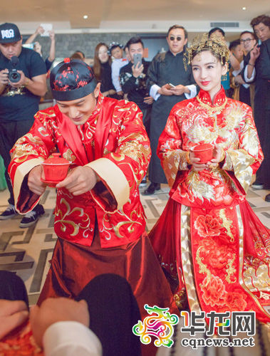 婚礼前的迎亲环节,黄晓明和Baby身穿大红中式婚服,跪地给父母叩首、奉茶。头戴金色发簪的Baby相当美艳,手接公公婆婆送上的大红包,更是笑得合不拢嘴。