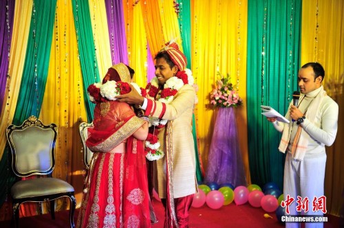 10月18日,新人在祭司的见证下,交换爱的花环。中新社记者刘冉阳 摄