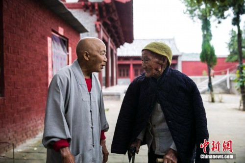 9月13日,山西省运城市,75岁的释演尼和她101岁的老父亲,老父亲亲眼目睹过抗战时期的中条山战役参加过解放运城的担架队。现在年事已高和释演尼住在清凉寺内。陈卫摄