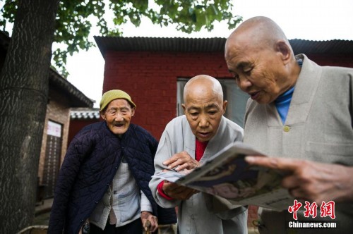 现在,释常音师傅和自己一位已经受戒的徒弟居住在清凉寺,每天过着青灯古佛的佛家生活。释常音的徒弟释演尼今年75岁,出家已经7年了,平时在寺院除了修行之外就是照顾师傅释常音的生活,由于出家在外,101岁的老父亲在家无人照顾,得到了师傅释常音的许可之后,老父亲随释演尼共同在清凉寺生活。图为9月13日,当地报纸上刊登着释演尼老父亲的照片,释演尼给师傅释常音看。陈卫摄