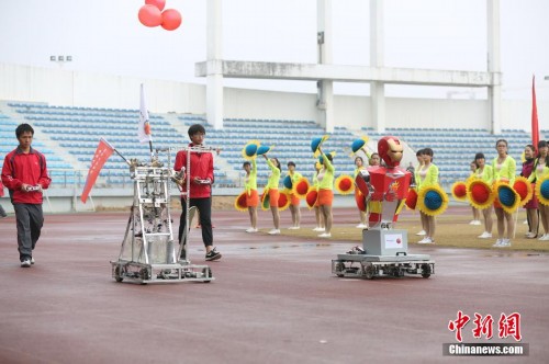 11月5日,江西南昌大学校运会开幕式上,各种大学生创意科技元素作品亮相,机器人与人现场对话、放礼炮,学生自主研制的最高时速可达150千米每小时的方程式赛车表演、航模表演等节目嗨爆全场。据介绍,该方程式赛车与机器人均由该校学子自主研发设计制作。图为机器人作跑步姿势。姜涛 摄