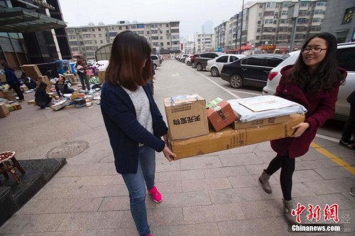 11月16日,山西太原国贸大厦附近,多家快递企业的快递人员在此扎堆分发快递,两名女白领收到快递。