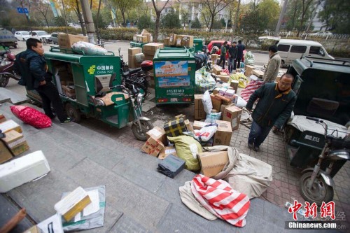 11月16日,山西太原邮政工作人员正在准备出发送快递。