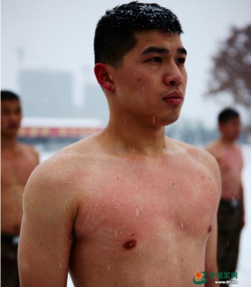 耐寒训练,战士身上的积雪已经融化。
