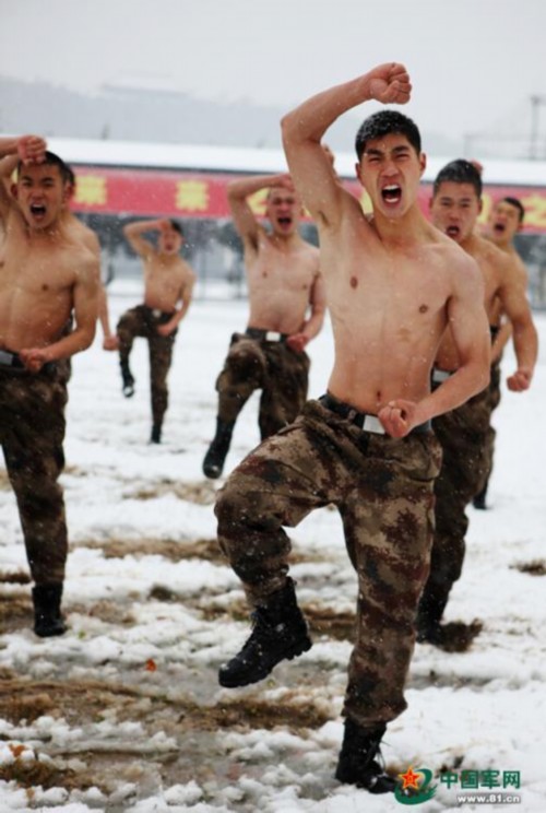 在雪地里进行捕俘拳训练,杀声震天。
