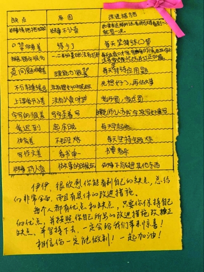 27日的家长会上,刘骏特意把孩子们写的卡片发给了家长,让家长在卡片上留言,帮孩子找出更多的优点。女生罗菁宇的缺点卡上写着自己的10条缺点:粗心大意、没有耐心、上课会开小差……优点卡上,只有“字写得好”四个字。看到这样的自我评价,家长罗新伟觉得有些心疼:“其实孩子优点挺多的,可能她自己没意识到,大人们的鼓励也少了”。他给女儿一口气找出了7个优点,工工整整写在“优点卡”上,并把卡片贴在桌角。