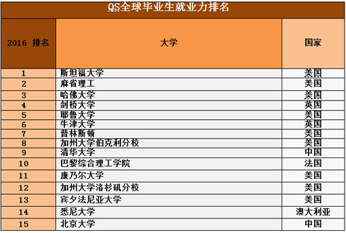 人民网北京11月30日电 (记者 郝孟佳)近日,QS全球教育集团正式启动全新世界大学排名——QS全球毕业生就业力排名。美国名校斯坦福、麻省理工、哈佛大学毕业生就业能力排名全球前三甲。耶鲁、普林斯顿和伯克利分列全球第5、7、8名。