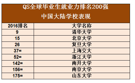 “毕业生的就业一直是很多国家高度关注的热点和难点社会问题。中国大学在本次排名中令人瞩目的好成绩是国际社会对中国政府和高校在毕业生就业上取得成绩的再一次肯定和认可。”QS全球教育集团中国总监张巘博士说,已经拥有不少世界一流大学的中国,不仅会培养出越来越多在中国和海外拥有高度竞争力的国际复合型人才,也会在不久的将来,吸引到更多欧美发达国家最优秀的学生来华学习工作,促进中国经济繁荣和世界和平友好。