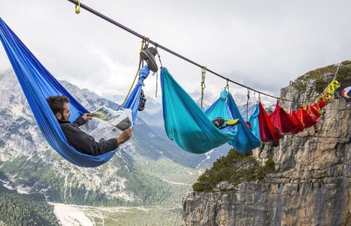 在意大利皮亚纳山的峡谷间,26名冒险爱好者在高空绳索上挂着色彩艳丽的吊床。照片上,他们有的在休息,有的在开玩笑,还有的在吹萨克斯、读报纸或者递饮料,其余的则在睡袋里安静地思考。没有人因为这惊险的高度而感到恐惧。