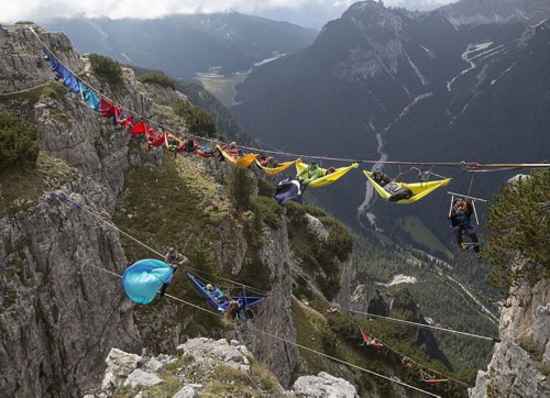 为了搭好吊床并安坐其中,系好安全绳的参与者必须在绳索上小心翼翼地前进。许多人此前已接受过高空走钢丝训练,他们先在吊床上过了一晚,第二天早上和其他参与者汇合后,又在绳索上呆了两小时。
