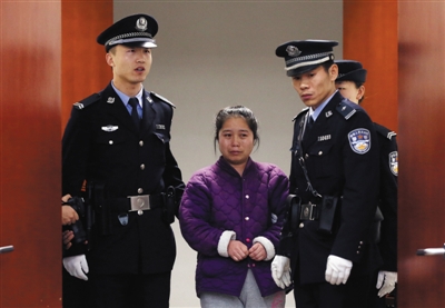 昨日,被告人杨某被法警带进法庭。她将两根断针扎入雇主家孩子体内,因故意伤害罪获刑一年。新京报记者 王贵彬 摄