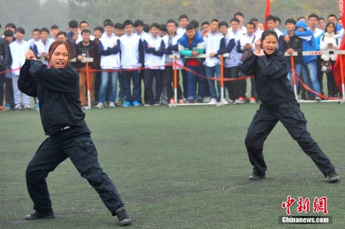该校护校队现有男女队员23名,是宜昌市首支大学生护校队,也是湖北省首支准军事化大学生护校队,除了日常巡逻外,队员们还要进行队列、拳法和棍法的练习。李传平 摄