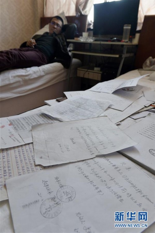 银川市一家小旅馆内,何胜望着满床的欠条和账单发愁(12月5日摄)。新华社记者 彭昭之 摄