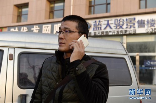 在宁夏银川市“蓝天骏景”售楼中心外,何胜在给开发商负责人打电话要债(12月6日摄)。新华社记者 彭昭之 摄