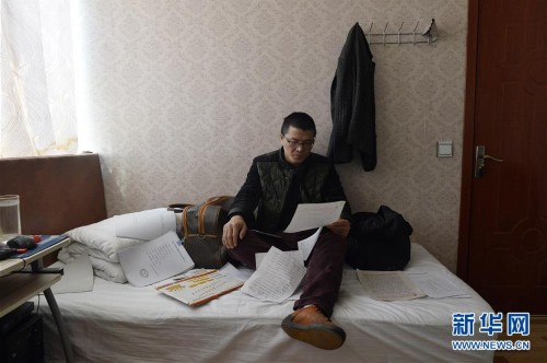 在宁夏银川市一家小旅馆内,何胜正在床上翻看欠条和账单(12月5日摄)。新华社记者 彭昭之 摄