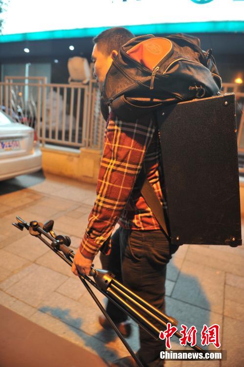 图为唐铭每次出去表演都要背着四五十斤的设备。习惯了自由的他,并不适应早九晚五的上班,更喜欢街头表演。 吕明 摄