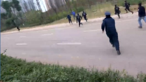 根据GPS返回的数据,警方在嫌疑人必经途中设卡、设伏。待嫌疑人骑车至遂资眉高速延长线十字路口时,警车卡点将嫌疑人逼至字库山公园二期一条人烟稀少的道路上,随后4辆警车包抄,将摩托车逼停。男子弃车,准备往山林中逃窜,警方迅速合围去,将其制服。此时,等候在一旁的无人机升空,航拍了整个抓捕过程。图为警方突然冲出埋伏扑向嫌疑人。