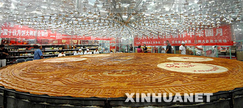 8月21日,在沈阳揭幕的首届中国烘焙食品节上,10位月饼大师联手现场制作的直径大约8米的超级大月饼亮相。对于这样的商业行为,有人认为是“商业创意”,也有人责问“工程浩大”、“徒费钱粮”,争议之声不断。据介绍,“超级大月饼”皮和馅的重量至少有10吨。(新华社记者 李钢/摄)