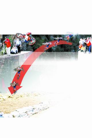 起始速度为零,沿着69米长的下坡,王会海的自行车下行。没有蹬车的动作,完全靠跑道的“助力”,王会海驾车沿着跑道中轴线加速前行。到达跑道转折点,车头上扬,自行车轨迹由下降转为上升。撞击木板的响声刚传到观众的耳朵,王会海的“战车”已到达了起飞点。