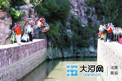 真险!逆风“飞行”,“自行车飞人”王会海飞越时,人和车被近5级的风吹转了方向,侧着飞过了红旗渠。