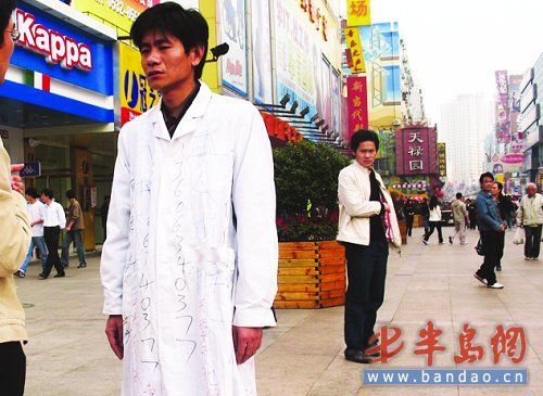 24日下午,在青岛台东三路步行街上,一名身穿白色大褂,前后写着“本人出租”字样的小伙站在街头,吸引了众多市民的眼球。据了解,这名小伙之所以愿出租自己的身体,为商家做“活”的广告牌,是为了筹钱寻找失散的妹妹。市民对此却褒贬不一。