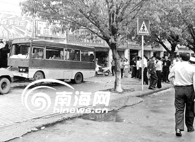 10月31日中午12时10分左右,海口公交8路中巴车,行驶到白龙南路海口第4中学公交车站时,突然冲向在公交站台等车的人群,将正在等车的3名学生撞倒,失控中巴拖着两名学生冲过绿化带和非机动车道,撞墙后才停在了人行道上,事故造成3名学生1死两伤。