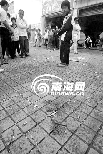 12时40分,记者赶到现场,看见车站候车亭北侧的绿化带内一片狼藉,绿化带外非机动车道路上散落着3只带血迹的拖鞋。现场已经拉起警戒线,警戒线内一辆车牌号为琼A44300的中巴车歪着停在人行道上,其前挡风玻璃、前保险杆等部件已经损坏,地上散落了一地的玻璃碎片。中巴车旁边的人行道上,有两滩血迹,现场交警说,是两名伤者留下的血迹。