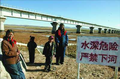7月,雨季,沱沱河干枯的河床上一条黄毛狗在奔跑,不见宽广河面,不见奔腾的河水,大地被烈日灼烤,裸露的河滩将水流分成几股向东远去。全长1389.6米的长江源特大桥横跨河上,桥北是江泽民题词的“长江源环保纪念碑”,桥南一块警示牌字迹清晰,上面写着:“水深危险,严禁下河。”