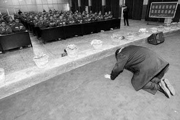 紧接着,张森站起来,向台下学员深深鞠了一个躬说:“我求求大家好好改造,争取重新做人!”