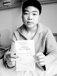 “我不想死,我要做给爸爸妈妈看,没有他们我照样活,而且活得比他们还好。”12月24日,本报接到小双邮自北京世纪坛医院的来信。昨天,在世纪坛医院的病房里,小双正捧着书看得入神,当他抬起头时,记者看到一张花季少年的脸,但这张脸却是毫无血色的苍白。