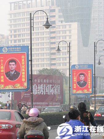 “听说,广告公司老板亏了六十万,就想把英雄好好宣传。”记者刚到金华时,曾经也是军人的的哥叶锦良带记者经过城南桥,指着显示屏,特地告诉记者这个细节。之后浙江在线记者再次向王超忠印证时,他挥挥手,闭口不谈。