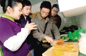 图片说明:昨天上午,研究生保姆正在接受厨艺指导。