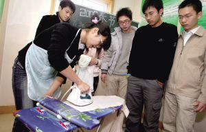 图片说明:几名研究生在家政公司学习熨衣服。记者 欧阳晓菲 摄