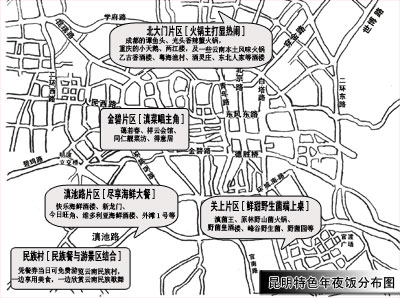 北大门区域的品牌火锅最为集中,成都的谭鱼头、光头香辣蟹火锅,重庆的小天鹅、两江楼档次高、口感好、环境好、服务好。此外,这个区域的酒楼风格最丰富,乙古香酒楼(滇味精品家宴)、粤海渔村(老牌平价海鲜酒楼)、酒灵庄(腾冲风味)、东北人家(东北风味)等等,不同的风味,可让你吃不腻。10人桌收费标准视实际菜品确定,人均消费30-80元。