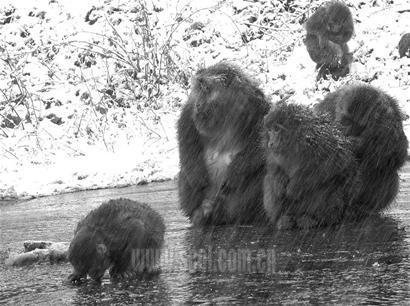 18日下午4时,龙池大雪覆盖的盘山道上,孙大爷略带佝偻的背影渐渐远去。身后,目光坚毅的猴王带着妻妾和臣民,向它们的晚餐地——存放玉米的猴王坪小木屋进发。几棵银装素裹的雪松下,一双长满老茧的手在空中划出一道道金黄的弧线,成千上万颗玉米掉落在一只只期盼的眼睛前。平时叽叽喳喳吵吵闹闹的猴群此时一片寂静,群猴都在暗中发力,尽可能多地把食物抢进嘴中,仅仅十来分钟,地上的玉米便被一抢而空。“猴子总是比人更容易满足!”孙大爷爱怜地看着他的“山娃”们。“酒足饭饱”后,猴王开始“嗷嗷”叫着和孙大爷告别,招呼着队伍向住处——位于半山腰的水帘洞而去,莽莽雪原瞬间把刚才还喧闹的精灵们还原成苍茫天地间的一个个小黑点。