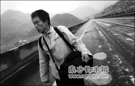 他的女朋友回家途中被困在湖南株洲,而且生病了,两天前,他决定从深圳出发,前往株洲照顾她。昨天下午2时许,记者在京珠高速公路隧道遇见这个24岁的打工仔时,他的头上顶着雨珠,脸冻得通红,裤腿都被雨水打湿了。他背着一个包,挎着一个包,但身上已经没有吃的了。